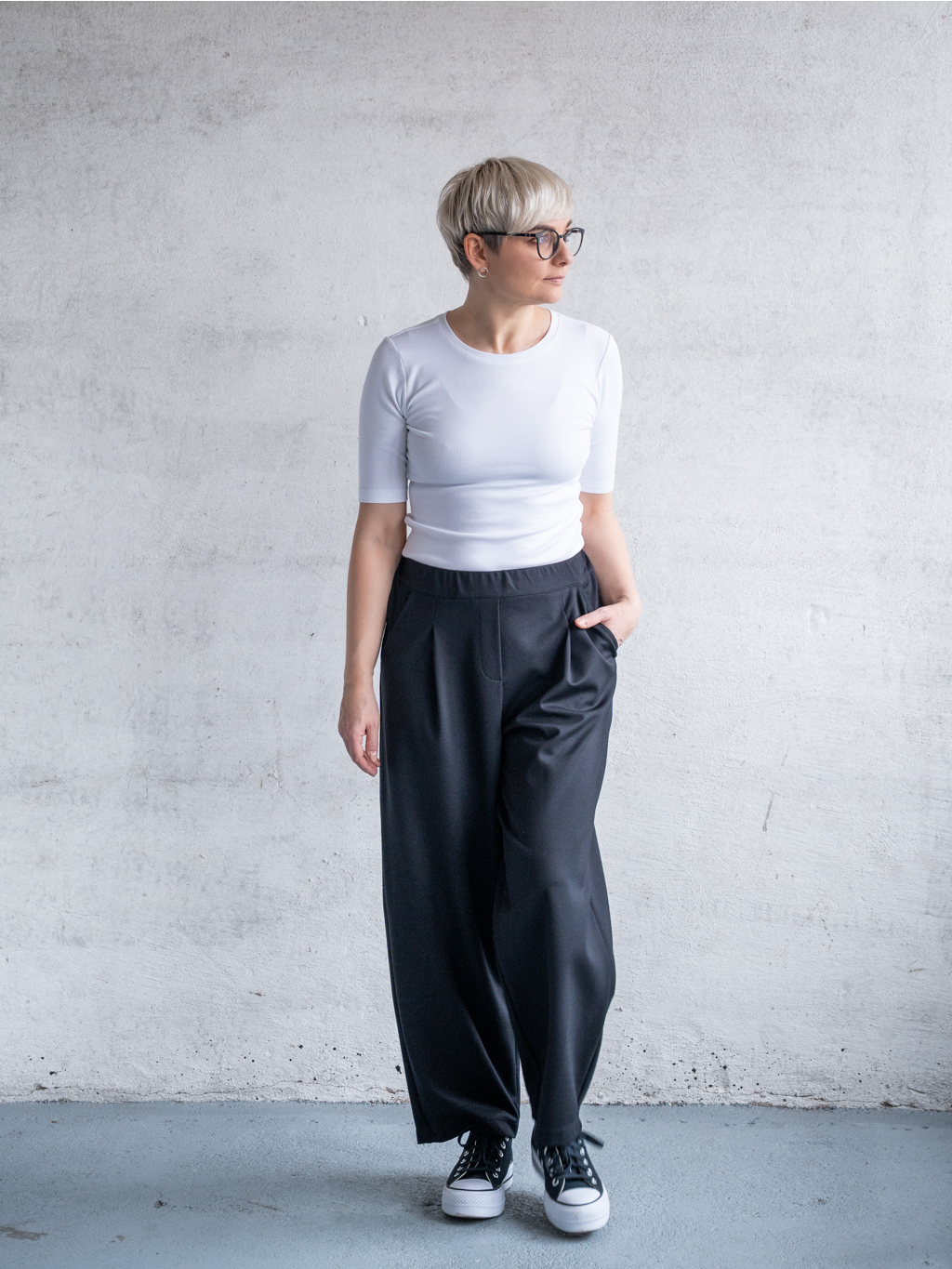 SLASH jsou univerzálně lichotivé. Vysoký pas opticky prodlužuje nohy, široké nohavice a sklady krásně vyrovnávají siluetu. Skvěle fungují pro postavy typu hruška i přesýpací hodiny, ale slušet budou prakticky každé z nás.