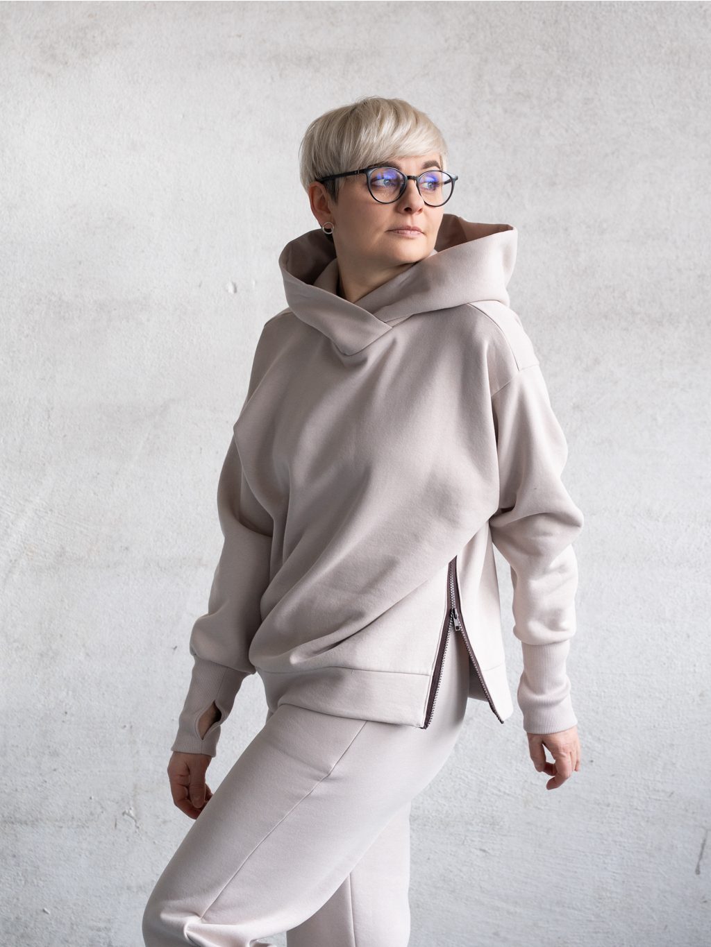 Mikina OZZY – oversize střih, veliká kapuce, široké rukávy s nápletem a dírou na palec, kontrastní tmavě hnědý zip, kapsa ve švu, náplet dole, vnitřní chloupek. Pohodlná, měkoučká – ideální na lítačku, sport i hory.