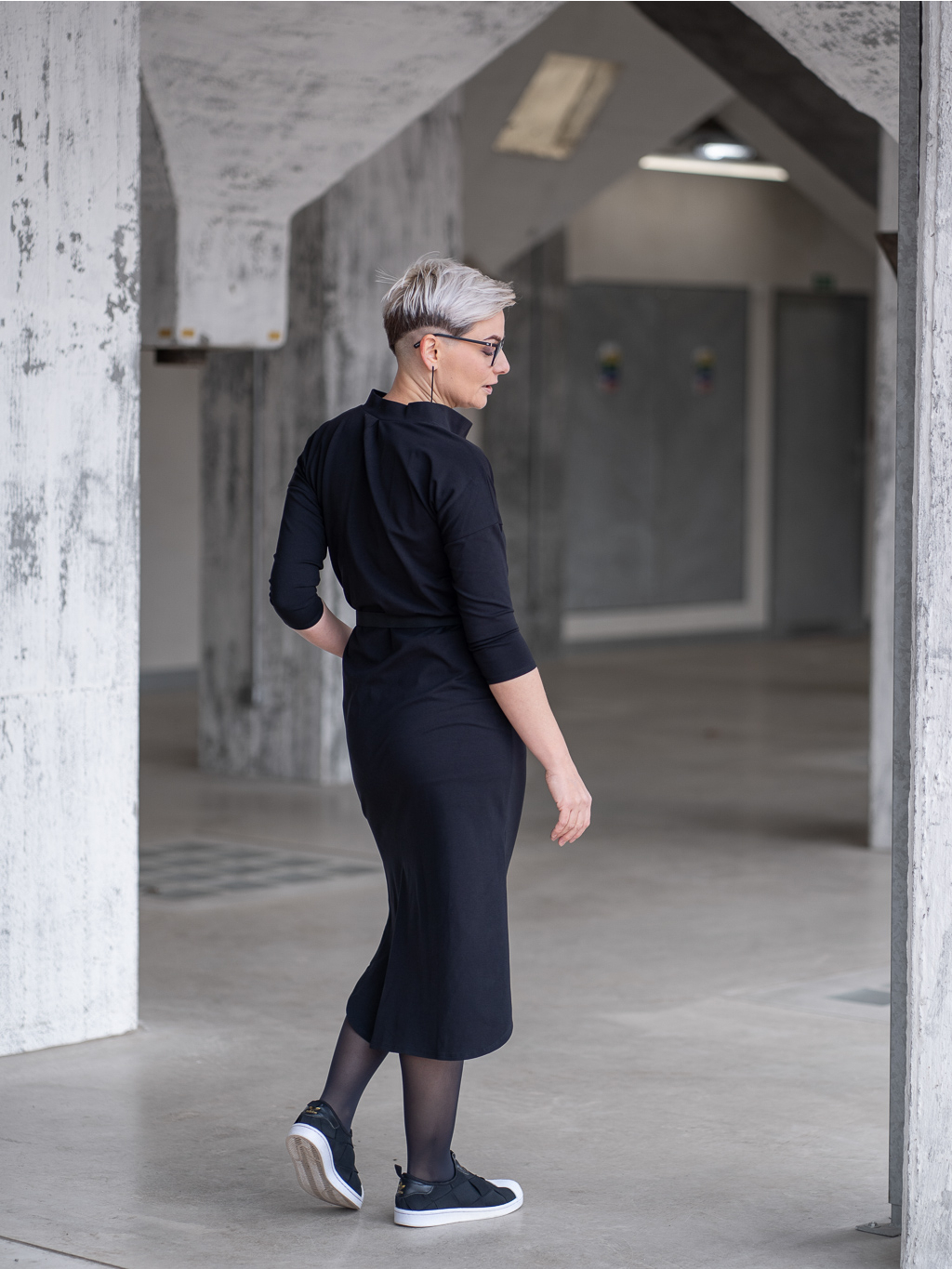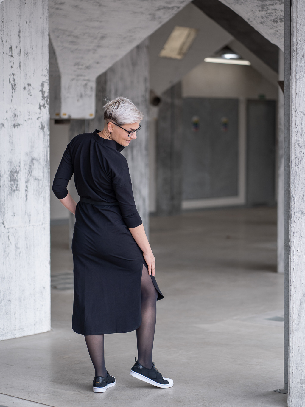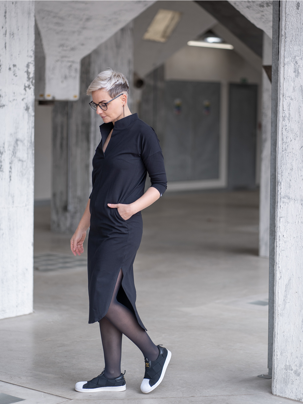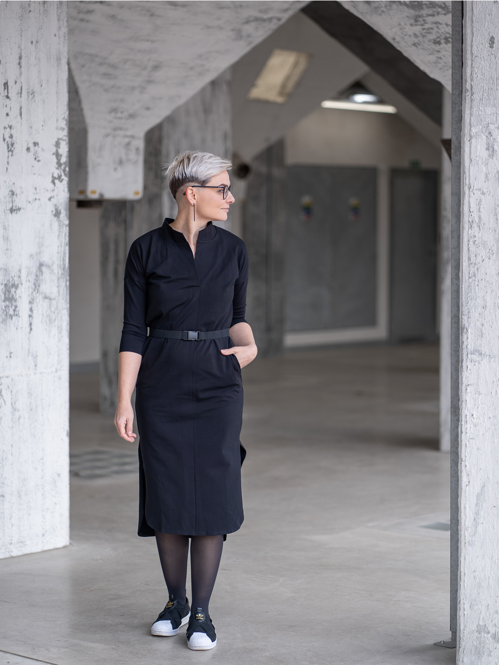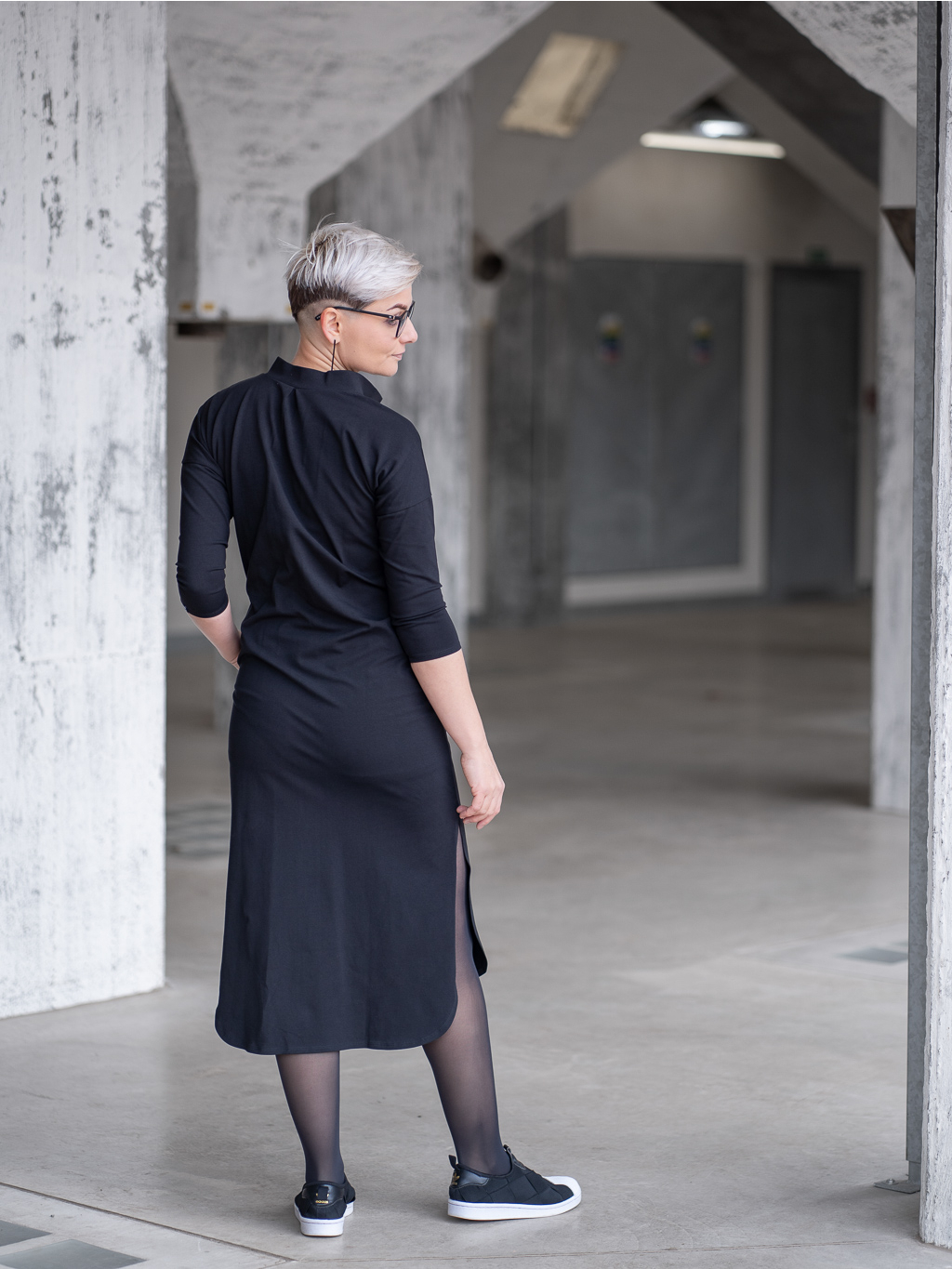 Mají originální střih i provedení. Díky falešnému skrytému zapínání se nemusíš trápit s hromadou knoflíčků. Jen je navlékneš přes hlavu a jdeš. Horní část u krku jsme vyřešili stojáčkem s hodně rafinovaným hlubším výstřihem. Šaty jsou delší, ale i u dolního dílu jsme zvolili odvážnější rozparky, které však neodhalí nic, co má být skryto a naopak podtrhnou tvůj sexy look. Můžeš je přepásat našim gumovým páskem, který jim zase dává trochu formální sportovní nádech. Šaty mají kapsy a svou délkou sahají pod kolena asi tak do půli lýtek.