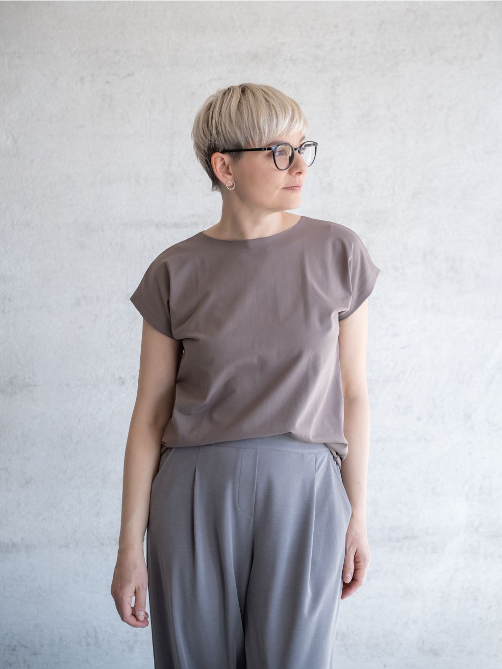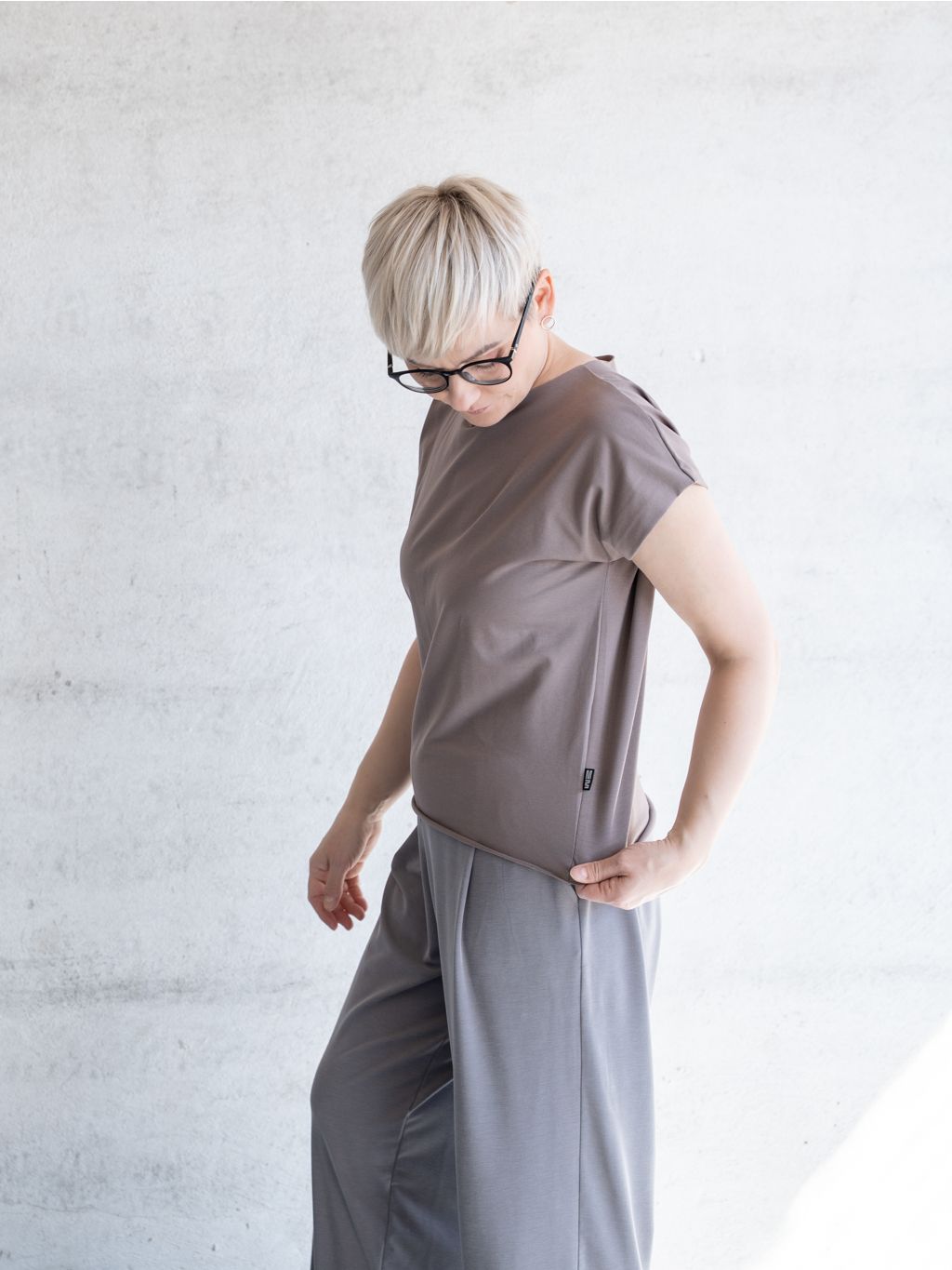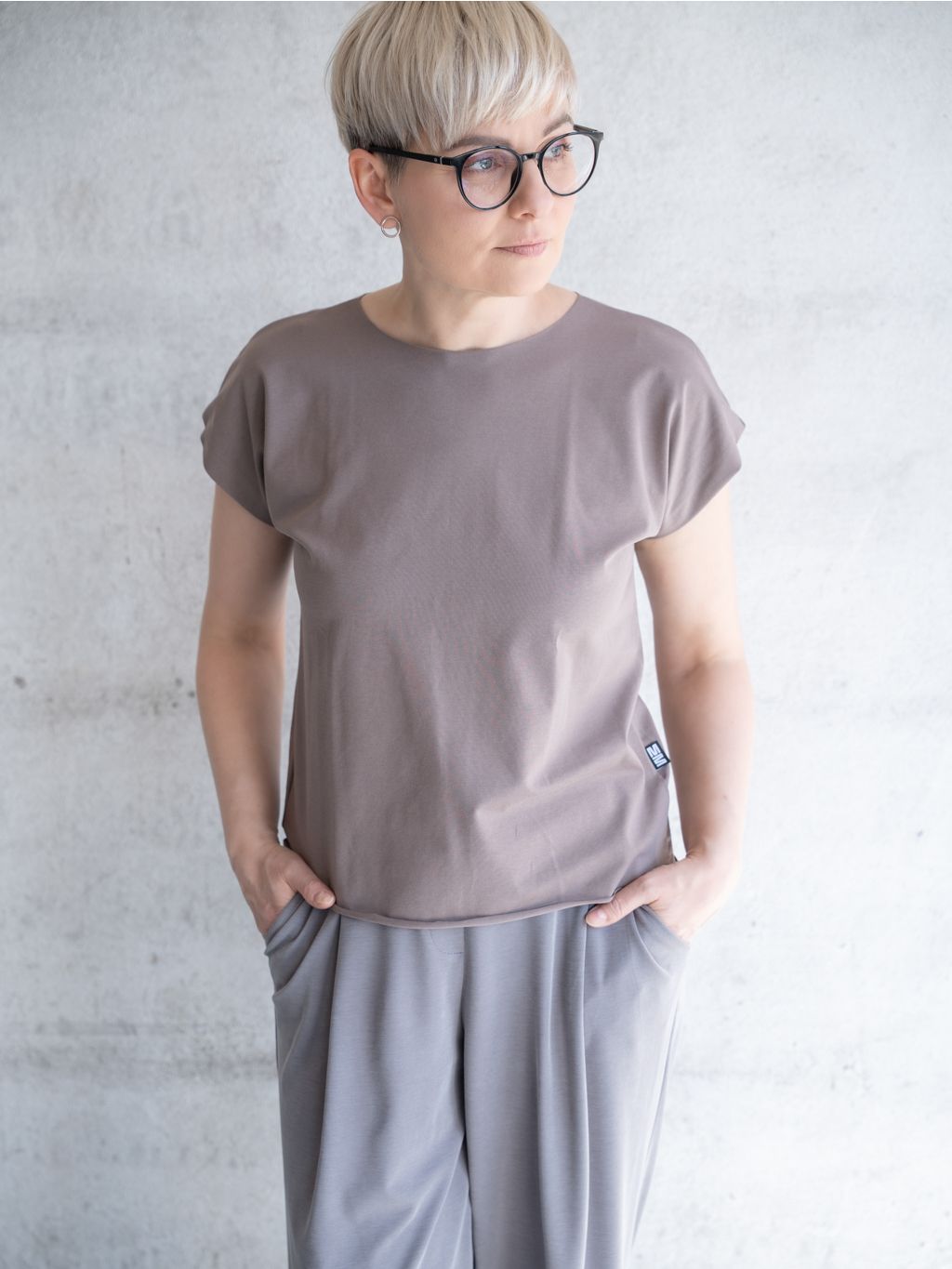 Malinko volnější, kratší délka, jednoduchý kulatý výstřih, nezačištěné lemy, které drží. Ideální do sukně, kalhot i pod sako. Navrženo a ručně ušito s láskou v naší dílně.