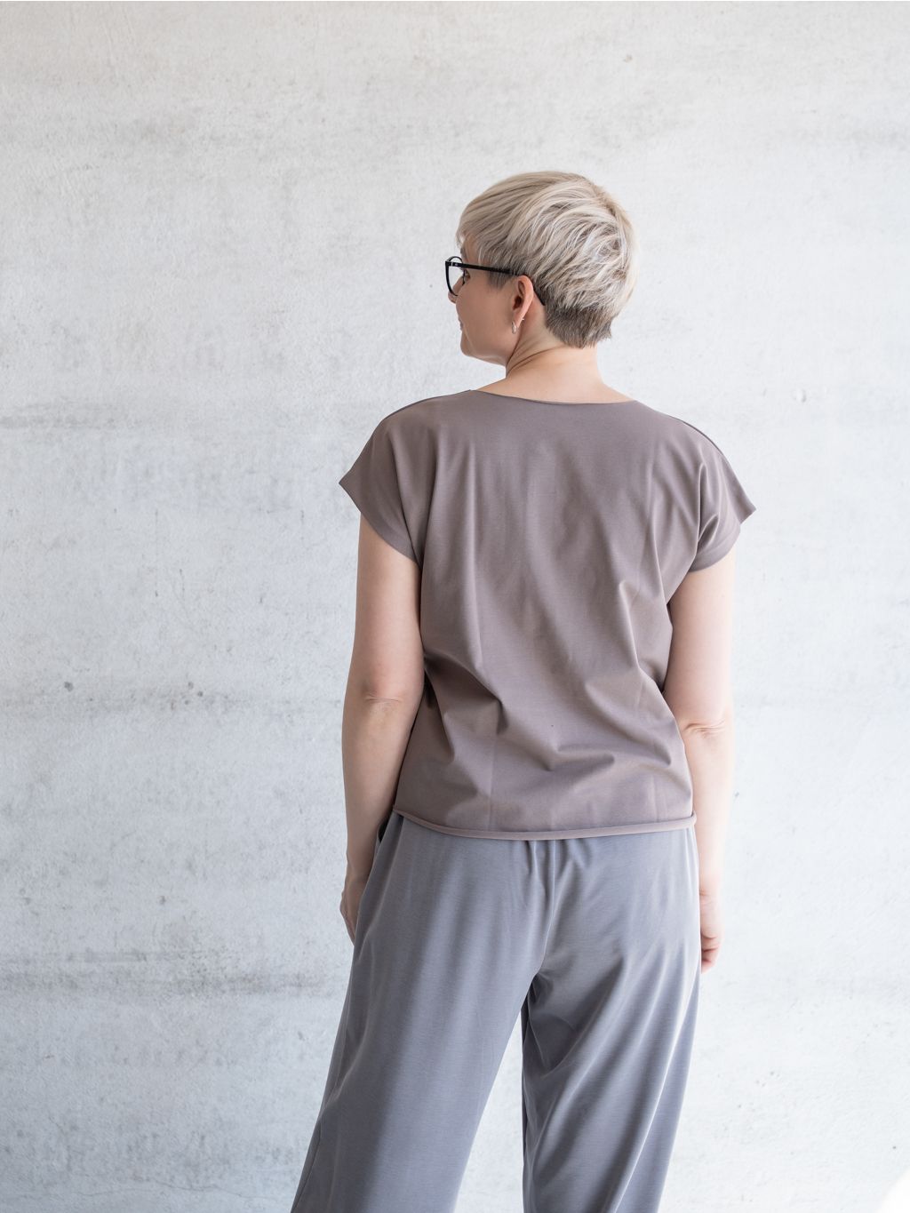 Výstřih je jednoduchý, kulatý, decentní a dělá malinko lodičku. Rukávy akorát – ani ne krátké, ani ne dlouhé – takže nenápadně schovají to, co nechceš úplně ukazovat. Dolní lem i lem u krku jsou nezačištěné, ale neboj – použili jsme speciální úplet, který se netřepí a krásně drží i po mnoha praních.