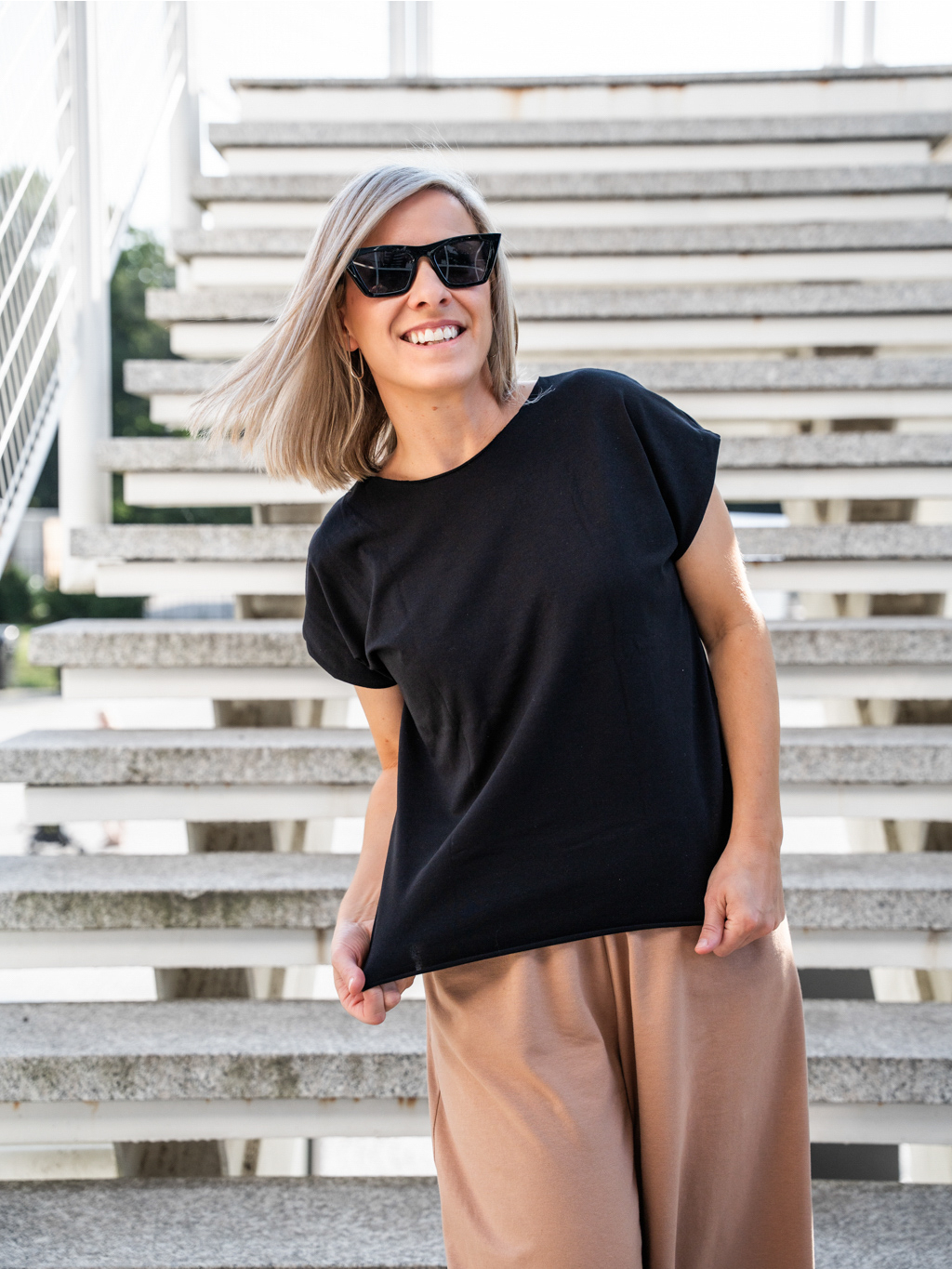 Výstřih je jednoduchý, kulatý, decentní a dělá malinko lodičku. Rukávy akorát – ani ne krátké, ani ne dlouhé – takže nenápadně schovají to, co nechceš úplně ukazovat. Dolní lem i lem u krku jsou nezačištěné, ale neboj – použili jsme speciální úplet, který se netřepí a krásně drží i po mnoha praních.